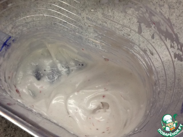 Я делала с клюквенным суфле, можно и без него. Для суфле нам понадобится 3 белка, клюква,100 г сахарной пудры. Взбиваем белки, продолжая взбивать добавляем сахарную пудру и клюкву. Все хорошо взбиваем. Суфле дает кексу приятный хруст.