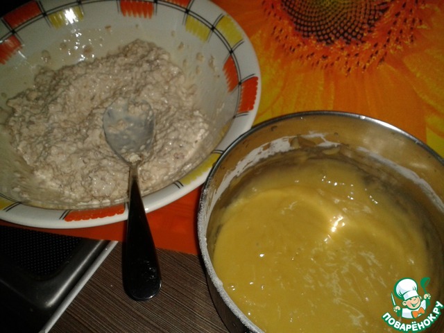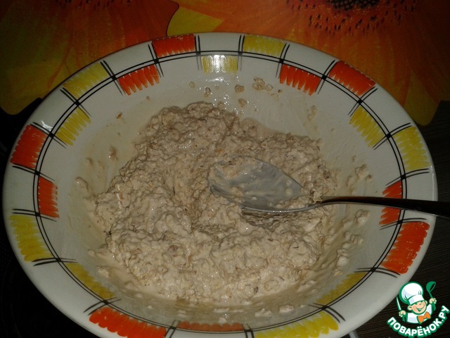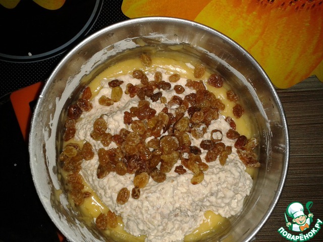 В полученную массу выложить набухшие хлопья, изюм. Тщательно перемешать.