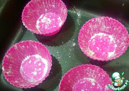 Подготовим формы, смажем их сливочным маслом и припорошим мукой. Распределим тесто по формам и поставим в разогретую до 170град духовку примерно на 40мин.