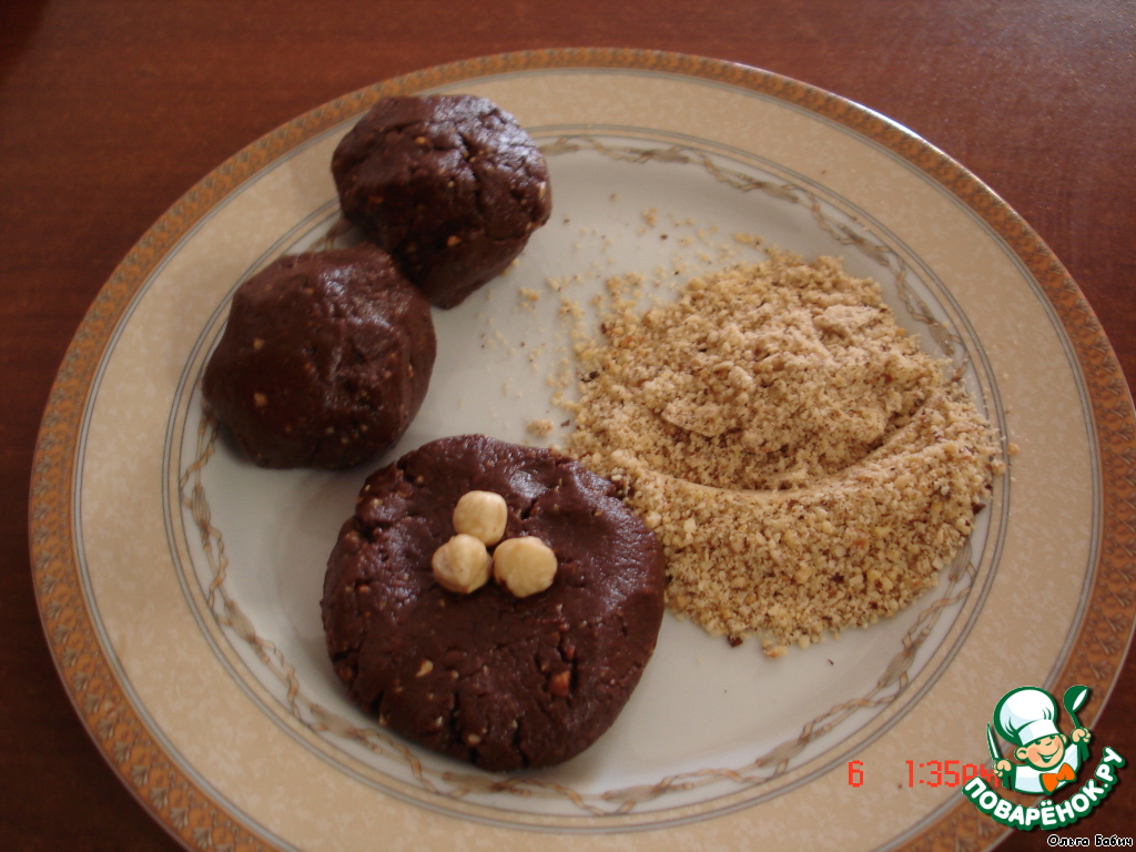 Из шоколадной массы сделать лепешку небольшого размера, в серединку положить орешки, цукаты (тут дело вкуса).