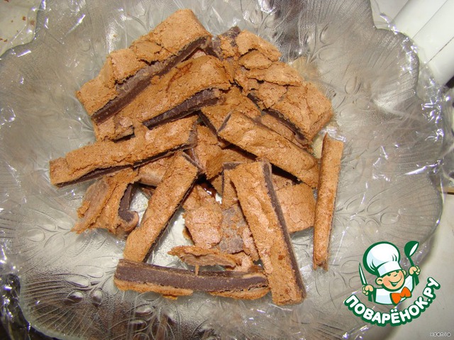 Бисквит режем на полосочки и выкладываем в застеленную пленкой форму (у меня большая салатница)