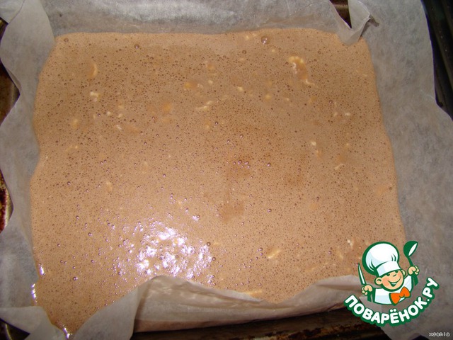 Выливаем тесто в форму (у меня случилась катастрофа: печка отключилась, бисквит подсел(((обычно бисквит получается замечательный по этому рецепту, ну ничего, все равно очень вкусно))))