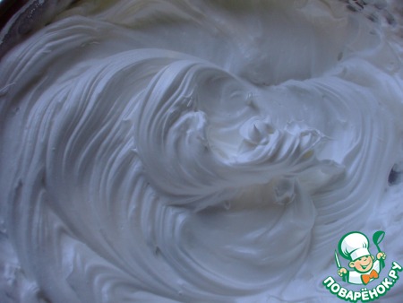 Взбить до пиков 185 гр сливок в холодной посуде. Аккуратно в несколько приемов ввести сливки в массу с маскарпоне, каждый раз перемешивая лопаткой до однородности.