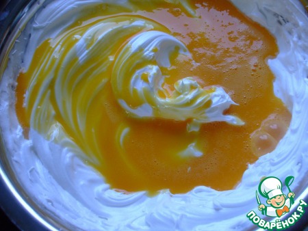 Слегка взбить вилкой 92 гр яичного желтка. Просеять 115 гр муки. (я добавила в муку еще 1/8 ч. л. разрыхрытеля –для подстраховки –это –«отсебятина», в рецепте такого нет)).