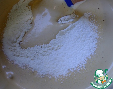 Сверху просеять муку и аккуратно перемешать лопаточкой, чтобы смешались все ингредиенты.