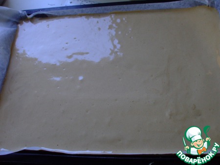 Распределить по противню. У меня 42 на 20 см. Толщина бисквита должна быть примерно 1-1.2 см. Выпекать около 10-15 минут (зависит от духовки) в предварительной разогретой до температуры 180 гр духовке. Готовность проверяется деревянной палочкой –она должна выйти из бисквита сухой.