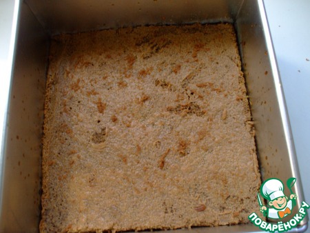 Пока крем остужается, берем форму или рамку 20 на 20 см, прокладываем края ацетатной пленкой (я не прокладывала, у меня разъемная форма). На дно квадратной формы кладем обрезанный и подровненный корж, пропитываем его половиной сиропа. Временно отставить.
