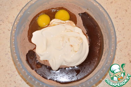 Добавьте яйца, сметану, растительное масло, ванилин, уксус и 1 стакан горячей воды. Деревянной ложкой размешайте до гладкого, однородного состояния.