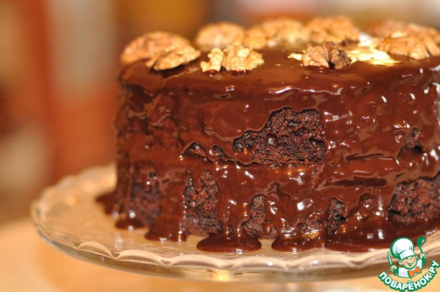 Положите один корж на блюдо карамелью вверх. Сверху нанесите половину глазури. Поверх глазури положите второй корж карамелью вверх и полейте оставшейся глазурью. Позвольте глазури стекать, этому торту свойственна такая небрежность. Украсьте половинками грецких орехов. До подачи можно убрать в холодильник.