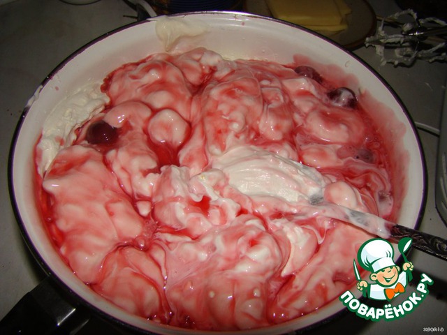Готовим крем.Желатин замочим в холодной воде.Вишневый сок доведем до кипения.добавим в него 100 грамм сахара.Крахмал разведем в небольшом количестве сока.И постепенно тонкой струйкой вливаем в сок постоянно при этом помешивая.У меня было немного мороженой вишни я добавила туда же.Затем растворяем в соке желатин.Снимаем с огня и оставляем немного остыть