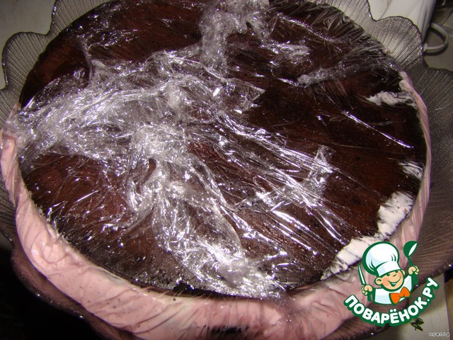 Закрываем пленкой и ставим в холодильник до полного застывания.(Я оставляла на ночь)