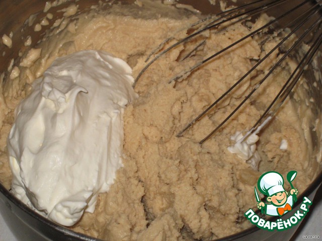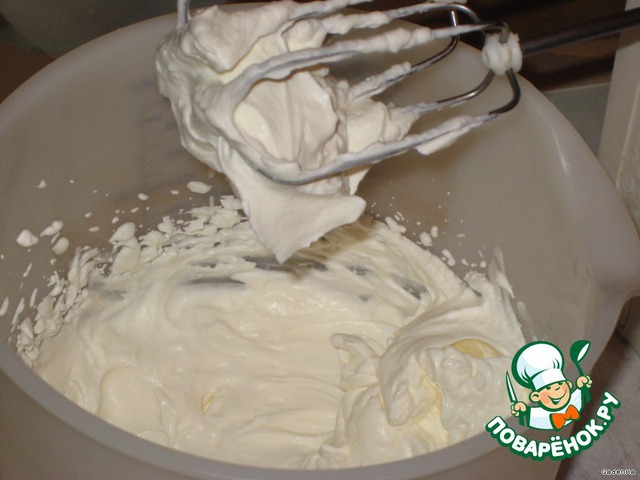 Аккуратно, вручную, смешать сливочную массу и взбитую сметану.