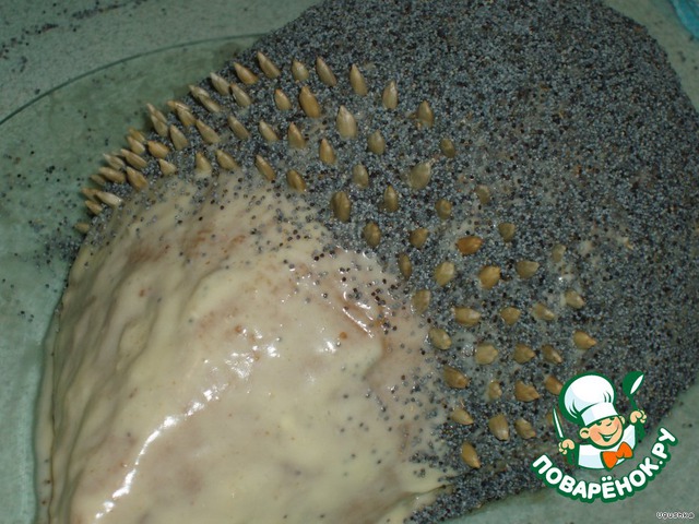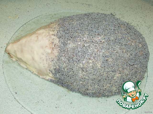 Прикрывая "мордочку" рукой или листиком бумаги, обсыпаем спинку маком. Удаляем лишний мак с подставки или блюда.