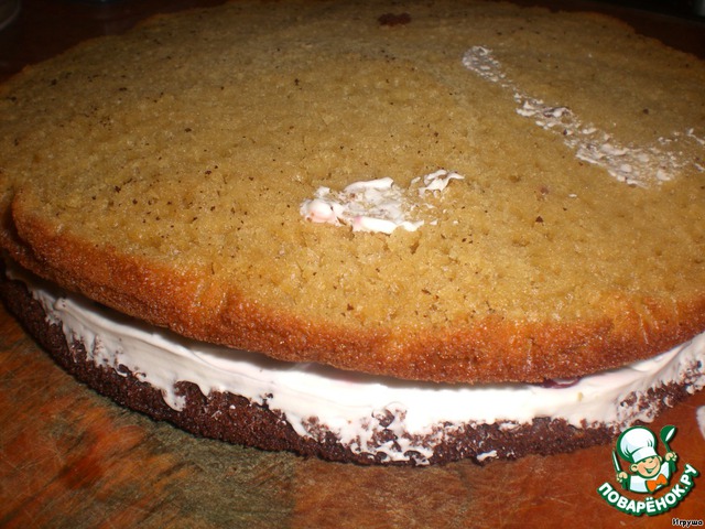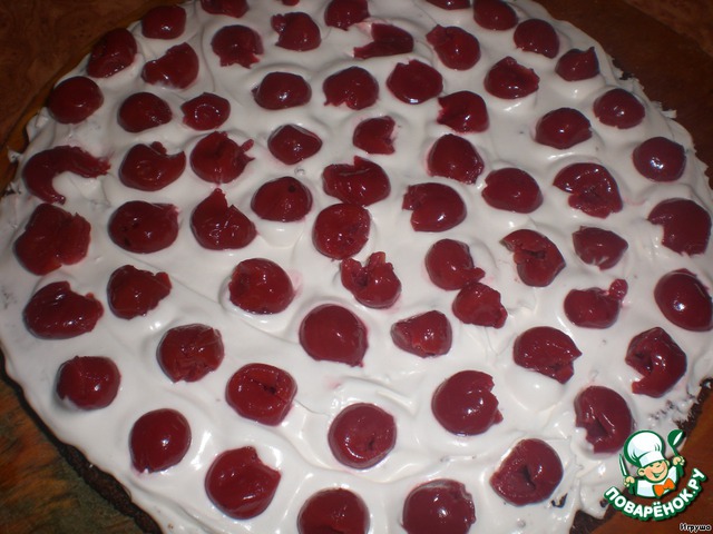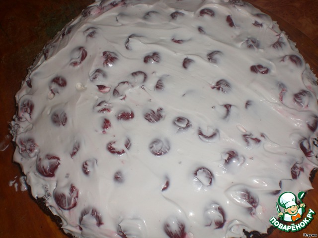 Так же поступаем далее: крем, вишня, крем, коричневый корж.