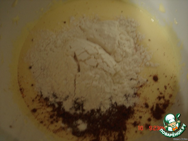 В желтки добавить какао и муку, медленно перемешали лопаткой.