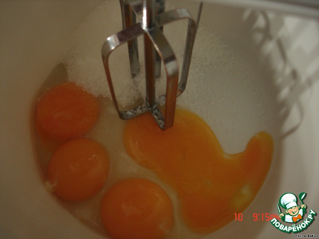 Белки взбить отдельно, постепенно добавляя сахар - 2-ю часть.