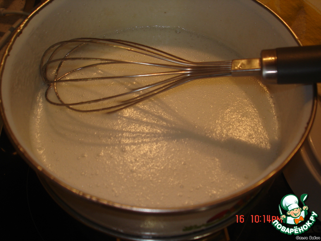 Готовим 2-й крем под мастику: в белки добавить сахар, поставить на водяную баню и постоянно помешивать до полного растворения сахара.