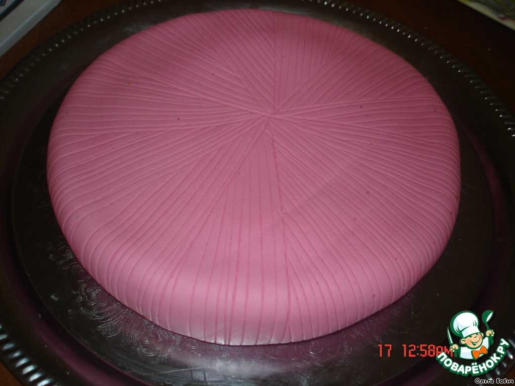 Замерив размеры маленького бисквита - это будет крышка нашей "коробки" - раскатываем мастику и делаем рисунок ножом для пиццы.