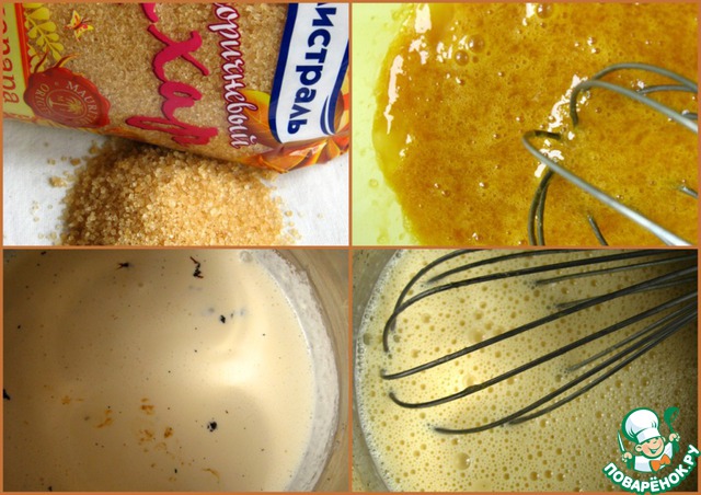 Разогрейте духовку до 160С. В небольшой миске разотрите желтки с коричневым сахаром, не взбивая смесь, они должны только соединиться. В небольшую кастрюльку с толстым дном влейте сливки и добавьте семена ванили, влейте ванильный экстракт. Доведите сливки почти до кипения. Снимите с огня и влейте чуть больше половины яичной смеси, при этом непрерывно мешая венчиком. Затем добавьте оставшиеся желтки. Тщательно перемешайте до однородности.