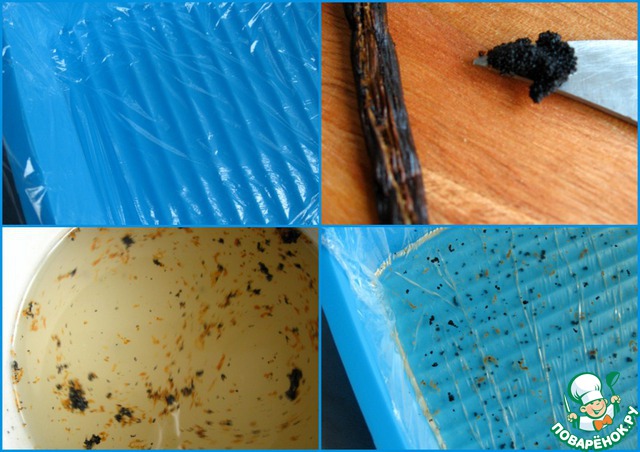 Подготовьте форму, размером 18х18 см. Поставьте ее в холодильник для охлаждения. Для удобства застелить форму слоем пищевой пленки. В небольшую кастрюлю сложите сахарную пудру, порошок агар-агара, воду и семена ванили. Отставьте в сторонку на 30 минут (это необходимо для набухания агар-агара). Затем доведите смесь до кипения. Помешивая, варите 2 минуты на тихом огне. Она должна стать прозрачной, лишь с вкраплением семян ванили. Вылейте полученную жидкость в подготовленную форму. И уберите в холодильник до застывания.