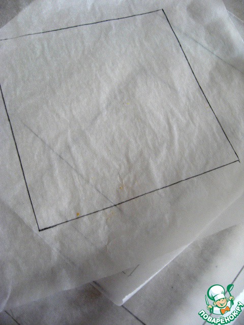 Приготовьте 3 листа бумаги для выпечки, на которых начертите квадрат со стороной 18см.