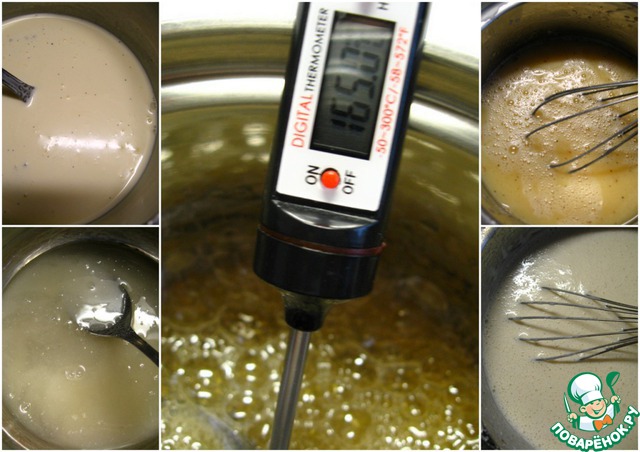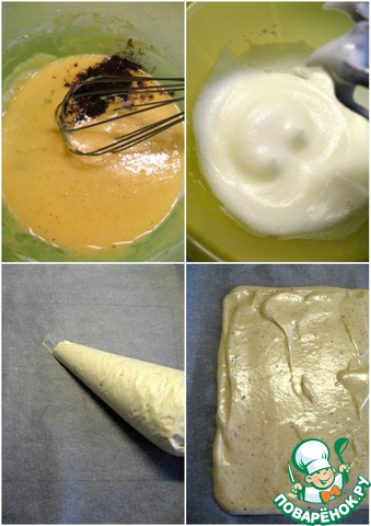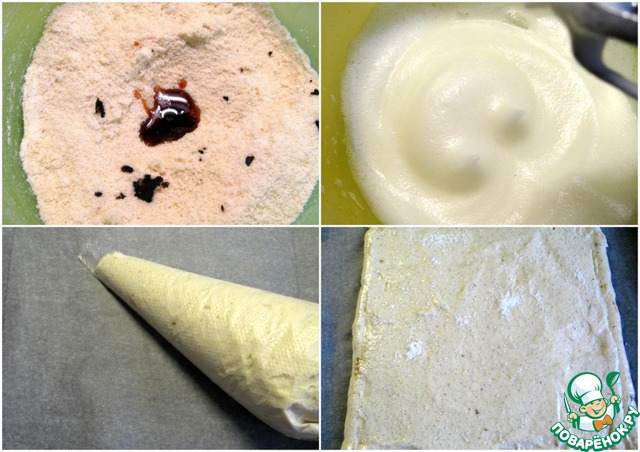 Бисквит «Ванильный макарон»: 53 г яичных белков, 50 г сахарной пудры, 150 г смеси (50 г муки, 50 г молотого миндаля и 50 г сахарной пудры), 1/2 стручка ванили, только семена
