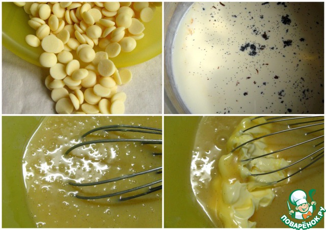 Ванильный ганаш: 300 г белого шоколада, 185 г жирных сливок 33-35%, 2 ч. л. ванильного экстракта, 1/2 стручка ванили, только семена, 95 г размягчённого, не соленого сливочного масла