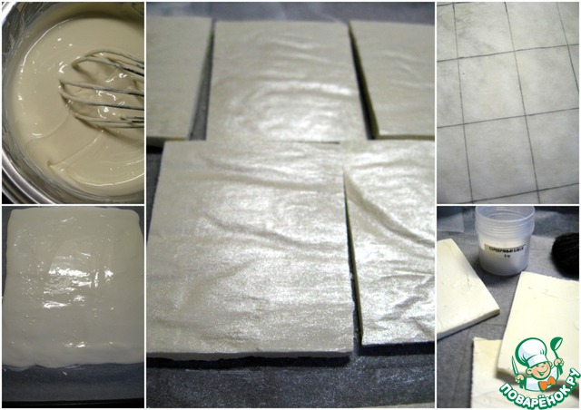 Украшение — шоколадные пластинки: 500 г белого шоколада, 10 г диоксида титана, сухой серебряный пищевой краситель (Candurin)