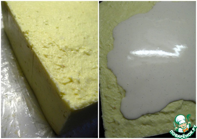 Ванильная глазурь: 9,5 г листового желатина, 60 г холодной воды, 40 г сиропа глюкозы, 35 г воды, 250 г сахарной пудры, 400 г жирных сливок 33-35%, 150 г нейтральной глазури, 1 стручок ванили, 8 г диоксида титана