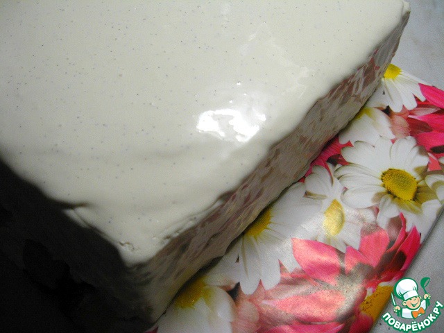 Далее Зумбо рекомендует поступить так: поместить 20 см квадратную форму для тортов на противень, покрытый бумагой пекарской. Ванильный шантильи крем взбить на средней скорости до мягких пиков. Используя кондитерский мешок с насадкой 11 мм в диаметре, чтобы выдавить слой толщиной 1см в форму. Бока формы проложить ацетатной лентой. Используя палетный нож, намажьте шантильи по сторонам формы примерно 1 см толщиной. Вытащить торт из холодильника. Освободить из формы, используя горячую воду и тряпку, протирая бока формы. Аккуратно поместить торт в форму, намазанную шантильи со слоем желе внизу. Аккуратно протолкнуть торт вниз. Заполнить пустоты кремом шантильи по бокам. Поверхность торта должна быть ровной. Поместить торт в холодильник на 3-4 часа до затвердения. Нагреть ванильную глазурь в микроволновке на средней мощности около 15 сек, хорошо перемешать и проверить температуру. Повторять процесс, пока глазурь не будет 30-35 С.