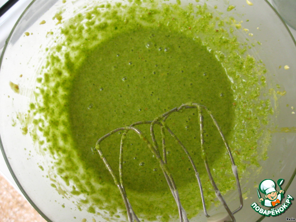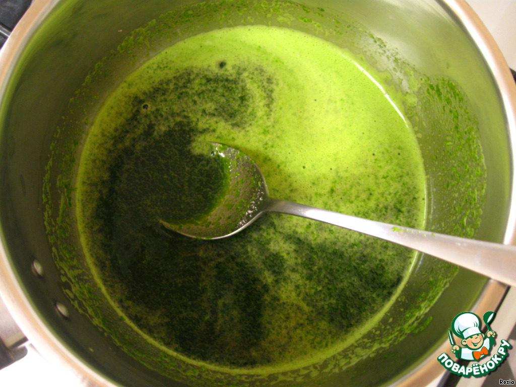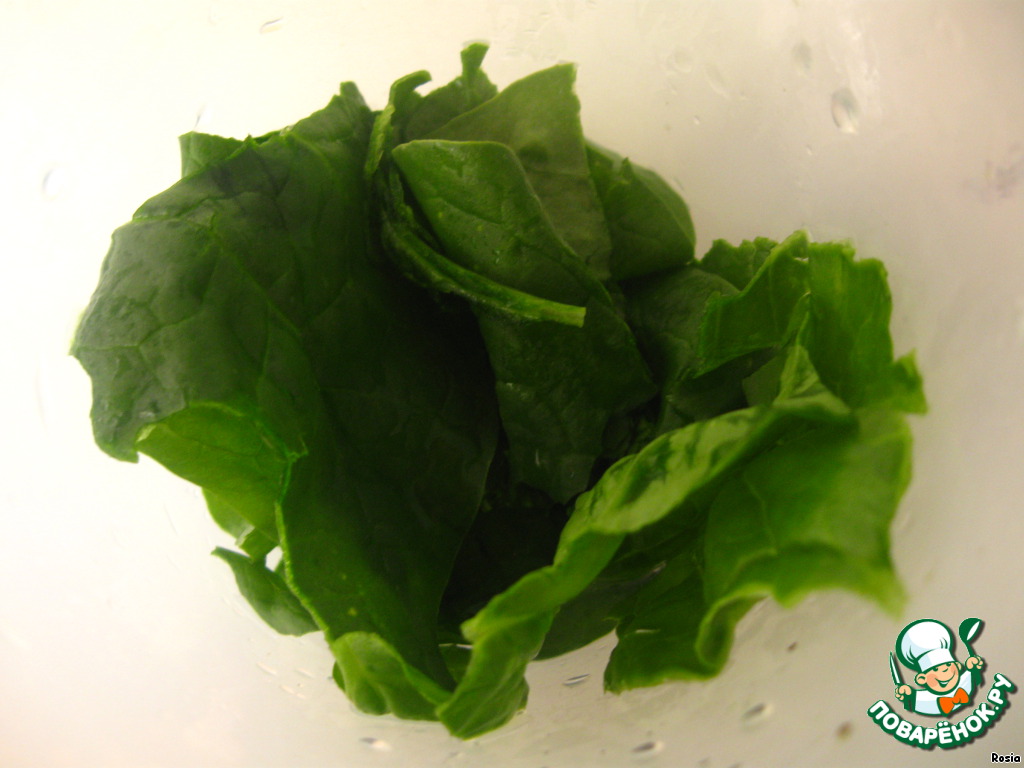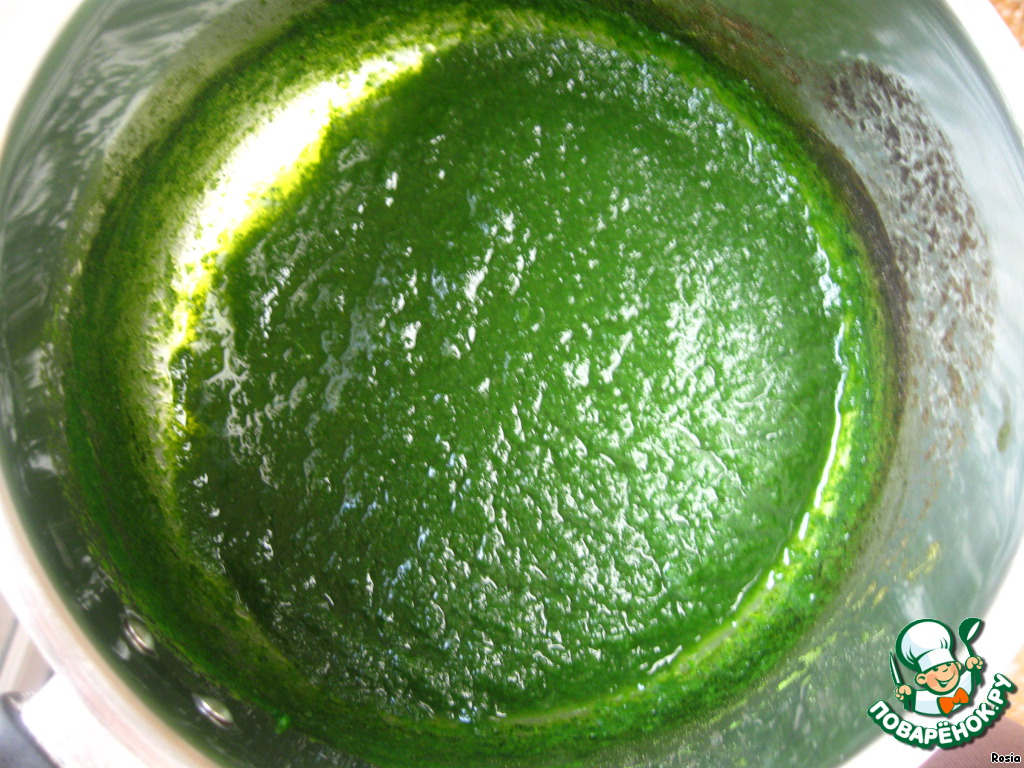Листья шпината промыть, поместить в стакан для блендера + 100 мл. воды, хорошо взбить блендером. Вылить в кастрюлю и кипятить до образования кашицы. У меня вышло 3 ст.л.