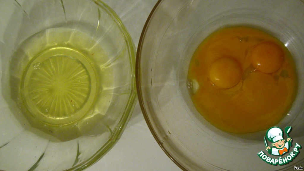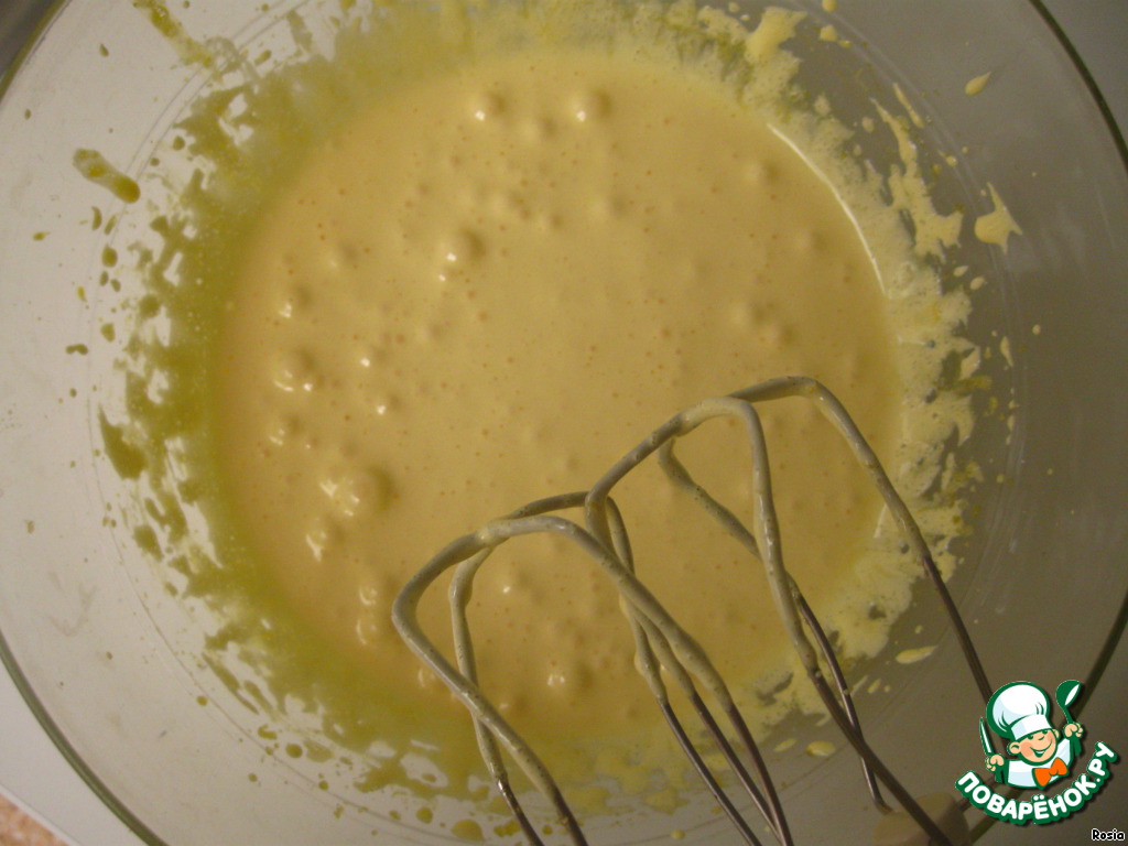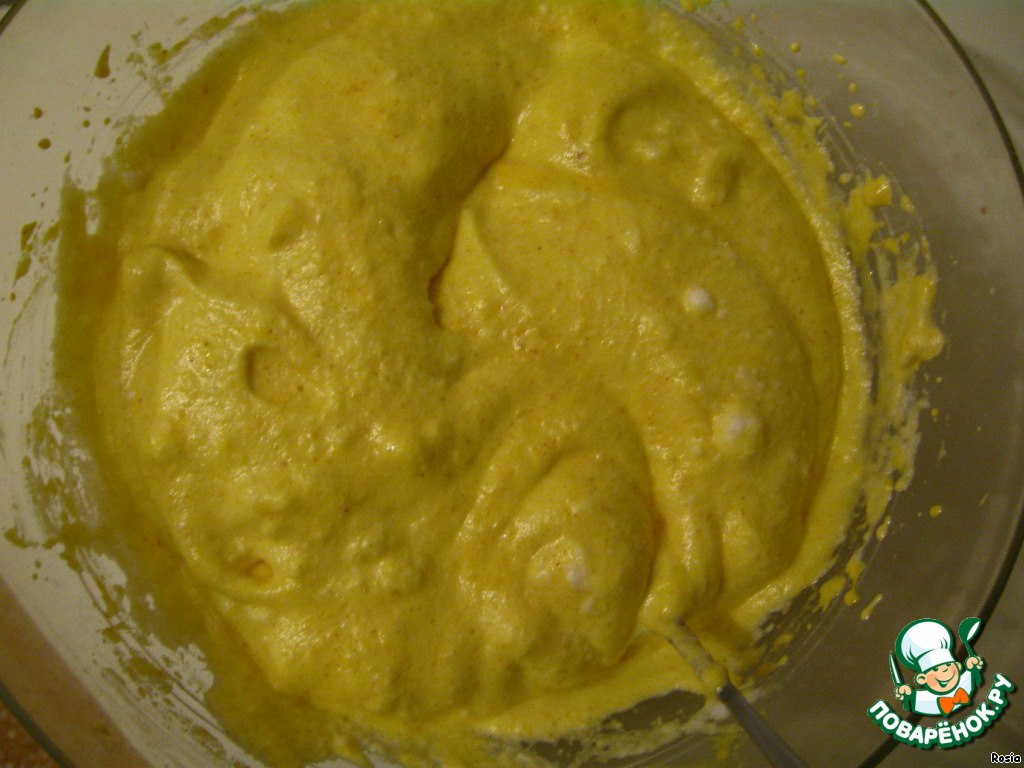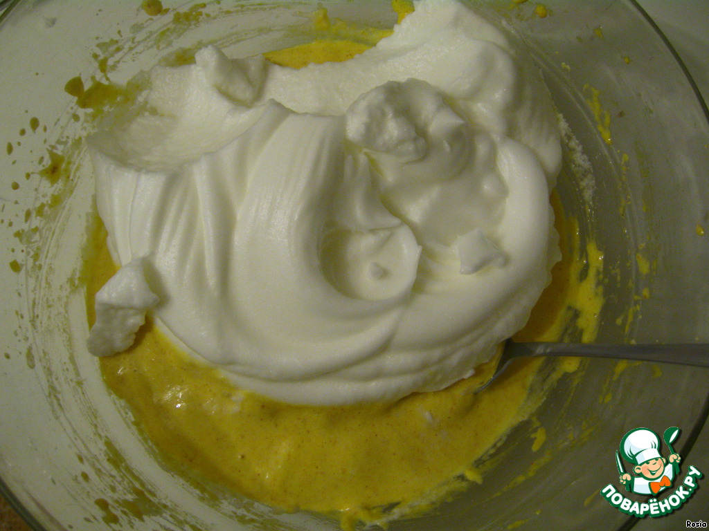 Белки взбиваем миксером в стоячую пену, добавляем в желтковую массу и аккуратно перемешиваем ложкой, как бы выворачивая наверх.