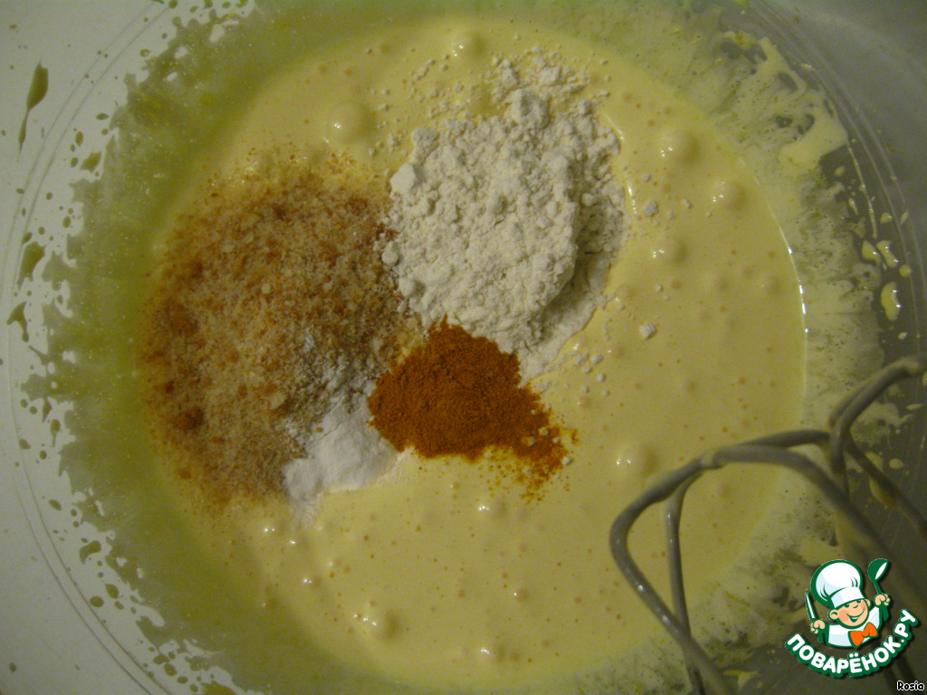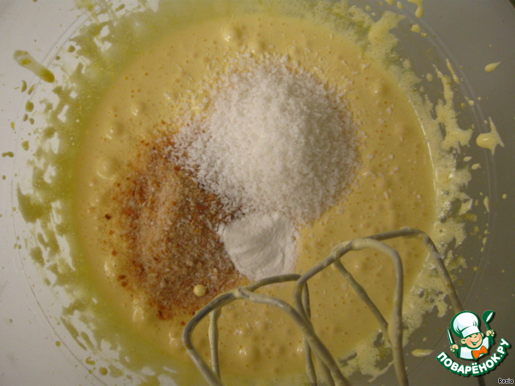 Дальше в эту массу добавляем 2 ст.л. сухарей + 2 ст.л. муки + 1 ч.л. куркумы + 1 ч.л. пекарского порошка и хорошо взбиваем миксером.