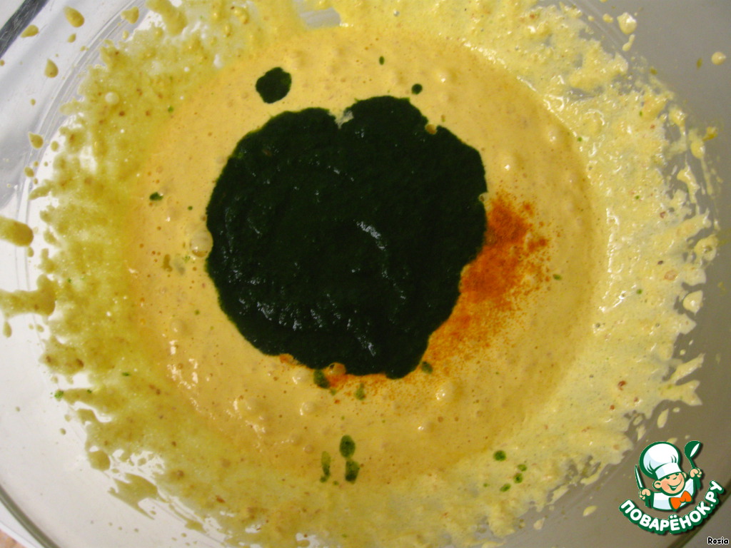 Дальше в эту массу добавляем 3 ст.л. сухарей + 6 ст.л. кокосовой стружки + шпинат + 0,5 ч.л. куркумы + 1 ч.л. пекарского порошка и хорошо взбиваем миксером.