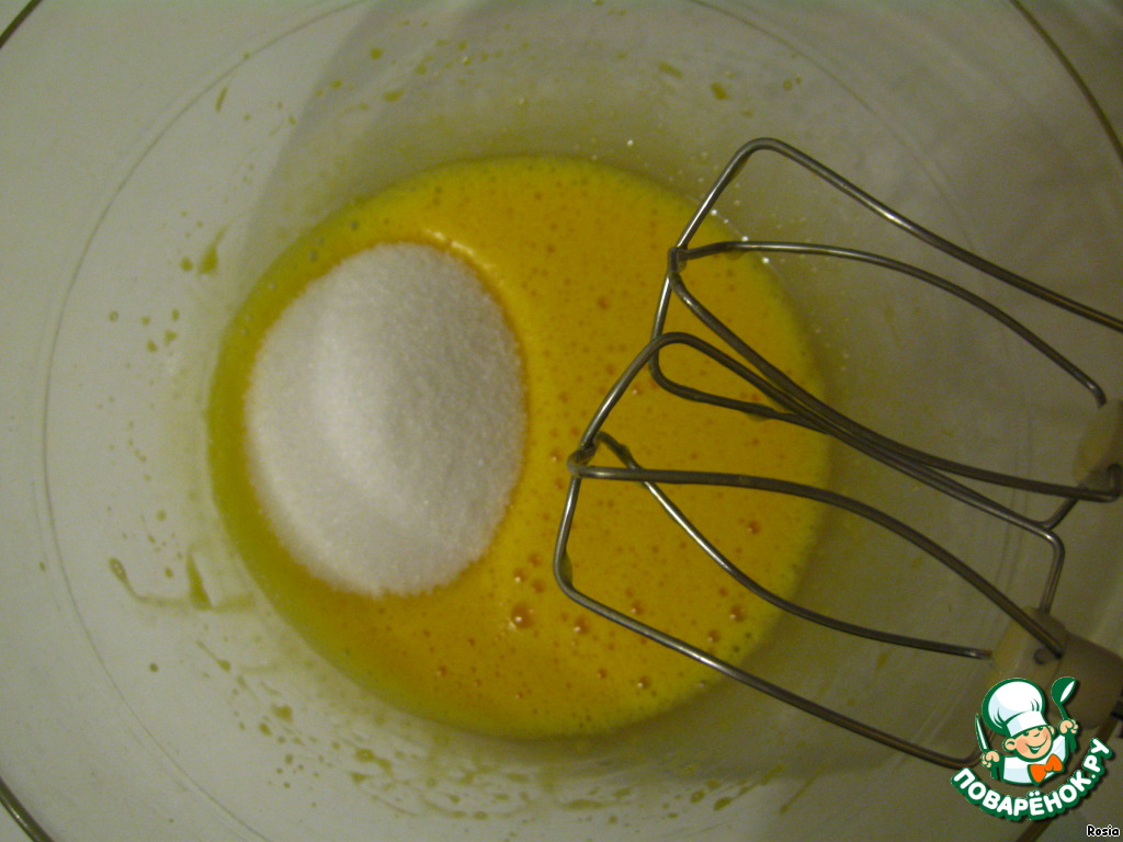 К желткам добавляем 5 ст.л. сахара и взбиваем миксером до удвоения массы.