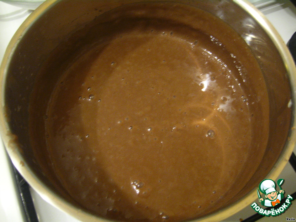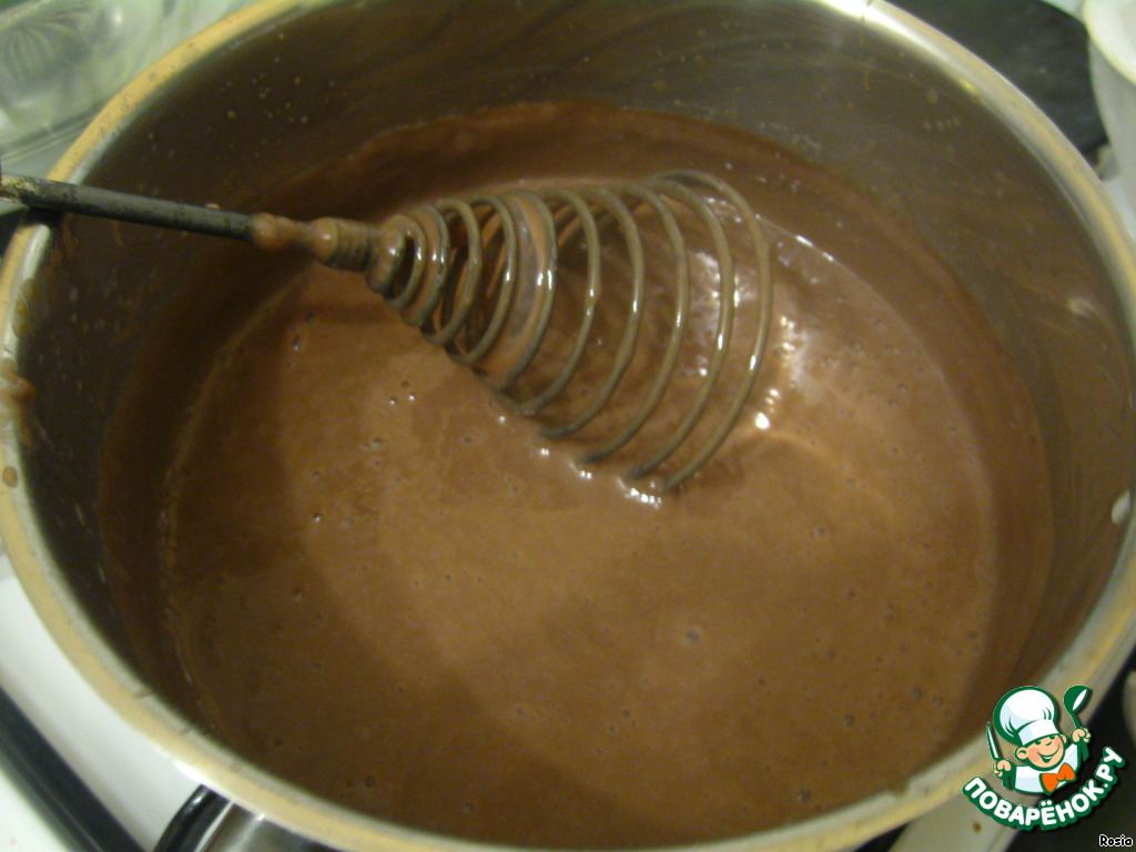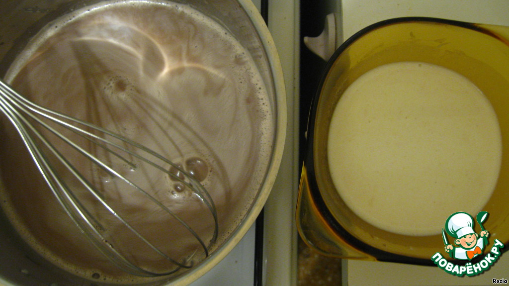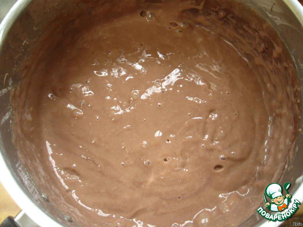 Молоко с сахаром и какао уже горячее, вливаем в него молоко с мукой и варим до загустения, постоянно помешивая.