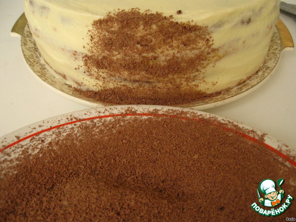 Посыпаем тертым шоколадом бока и 3 см. сверху от края.