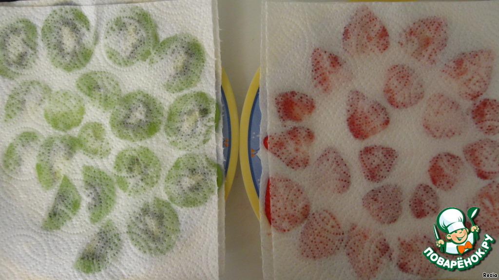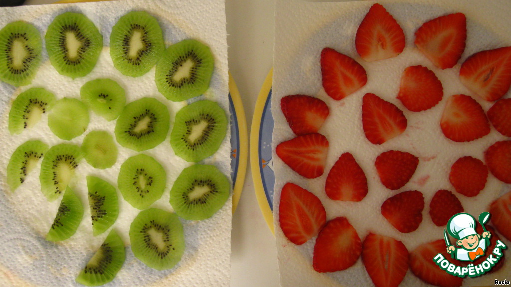Киви и 3 клубнички нарезать пластинками толщиной 3мм.