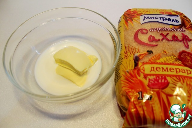 Добавьте половину муки и аккуратно перемешайте. Добавьте растопленное сливочное масло, так чтобы оно стекало по стенкам миски, и аккуратно перемешайте лопаткой.