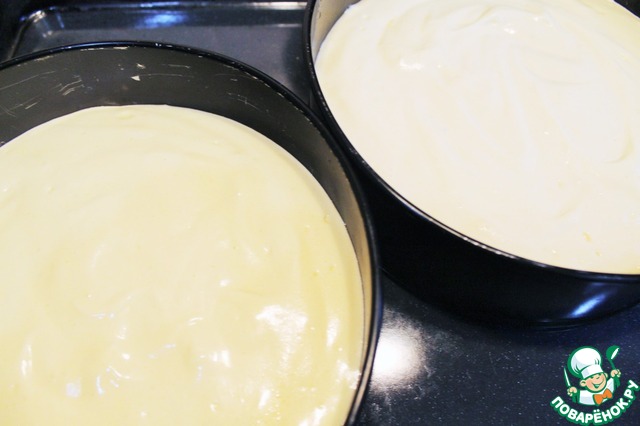 Налейте тесто на подготовленный противень и распределите тесто равномерно. Выпекать 5-7 мин.