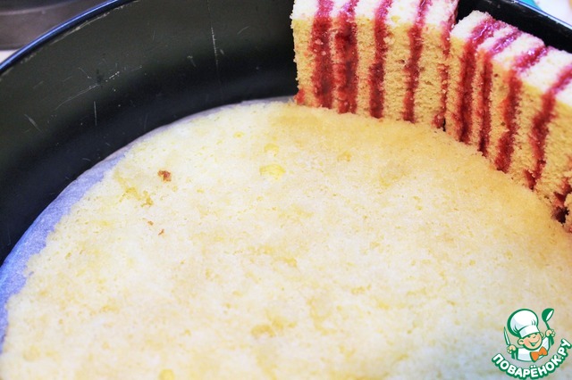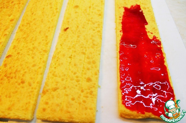 У охлажденного бисквита обрежьте края по периметру. Разрежьте бисквит на 5 полосок одинакового размера Намажьте бисквит, малиновым джемом.