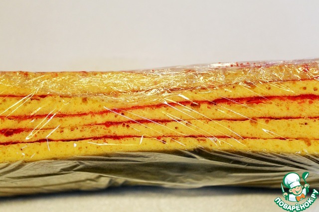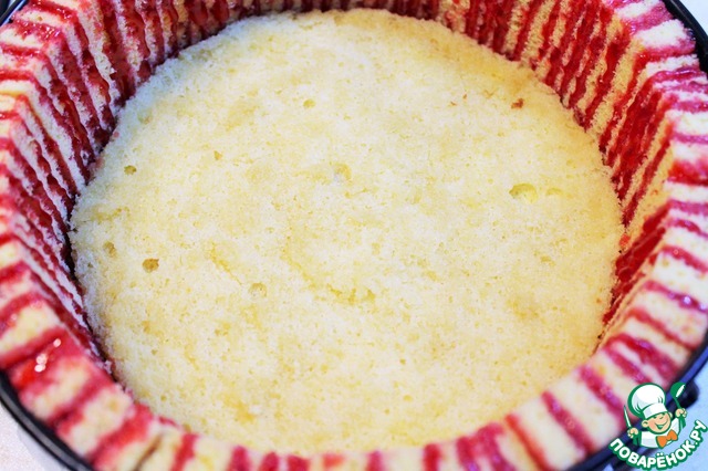 Накройте бисквит пищевой пленкой и поставьте в морозильную камеру для застывания на 40- 60 минут.