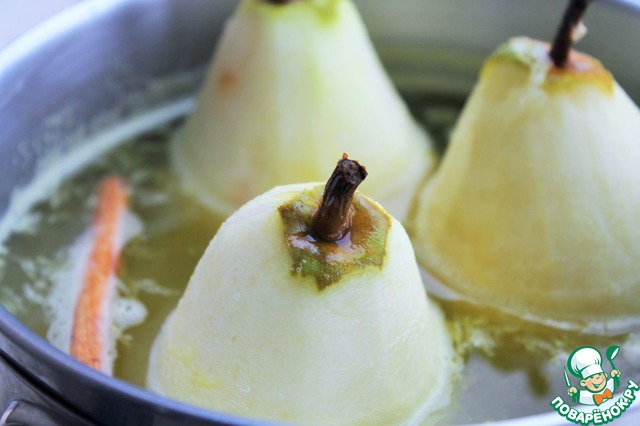 Пока варится сироп, сбрызнуть груши соком лимона. Переложить груши в емкость с кипящим сиропом и варить 15 минут на медленном огне.