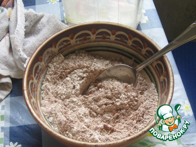 Делаем бисквит. Муку, разрыхлитель и какао перемешать.