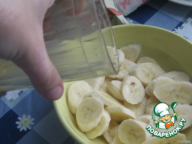 Бананы порезать кружочками, выдавить сок половины лимона, перемешать с 1 ст.л. воды и полить бананы.