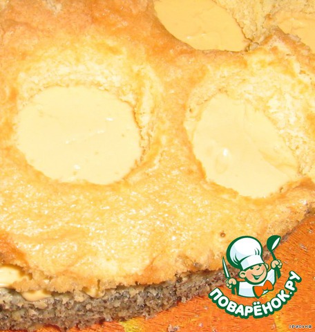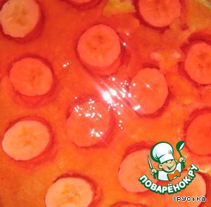 Заполнить отверстия кружочками банана. Когда желе начнет загустевать, залить верхний корж. Когда желе будет загустеет, смазать кремом. Уложить маковый корж.