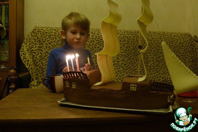 Сгущенку смешать с яйцами, добавить гашеную соду, какао и муку. Выпекать на средней температуре до готовности (проверяем деревянной палочкой). У меня были две прямоугольные формы - 26х18 (палуба- надстройки) и 38х31 см (основа корабля).