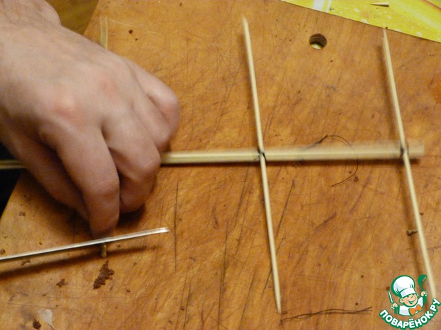 Из палочек для шашлыков связываем для нижней части 4, верхней - 3 и связываем их, создавая нужную высоту. Затем поперек привязываем реи (1 палочка). Подрезаем реи, формируя одну общую правильную трапецию. Связывали все обычной ниткой. Я доверила эту работу мужу.
