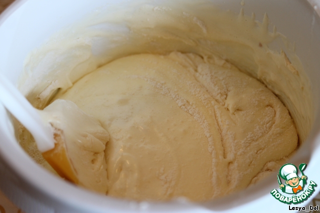 Взбить яйца со щепоткой соли, постепенно добавить сахар. Взбить до очень воздушного состояния. Всыпать по частям просеянную муку и осторожно вмешать лопаточкой в яичную массу.