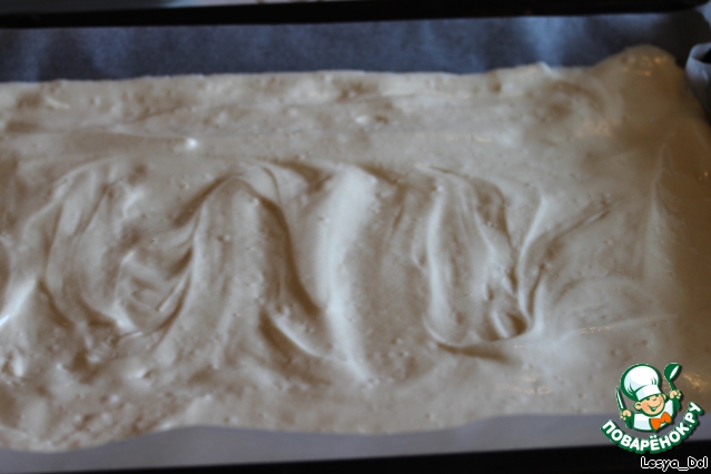 Покрыть противень смазанной маслом пекарской бумагой. Вылить тесто и разровнять. Выпекать в заранее разогретой духовке до 200 град. около 10 минут. Важно не передержать, тесто должно быть слегка золотистым.